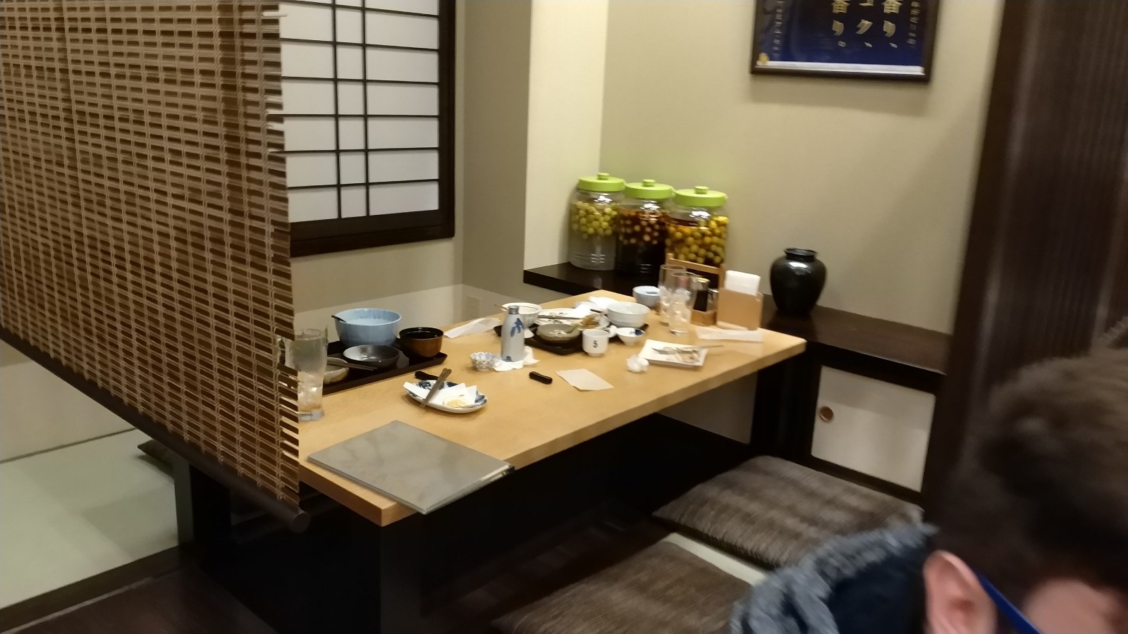La chica nos pregunta si hemos cenado y al decirle que no nos dice el único sitio que estaba abierto a esas horas a parte de la tienda. Nos dirigimos allí y disfrutamos de una buena cena en un lugar bastante bonito. La cena completa, con postre y todo me cuesta unos 1800 Yen (13,80€).