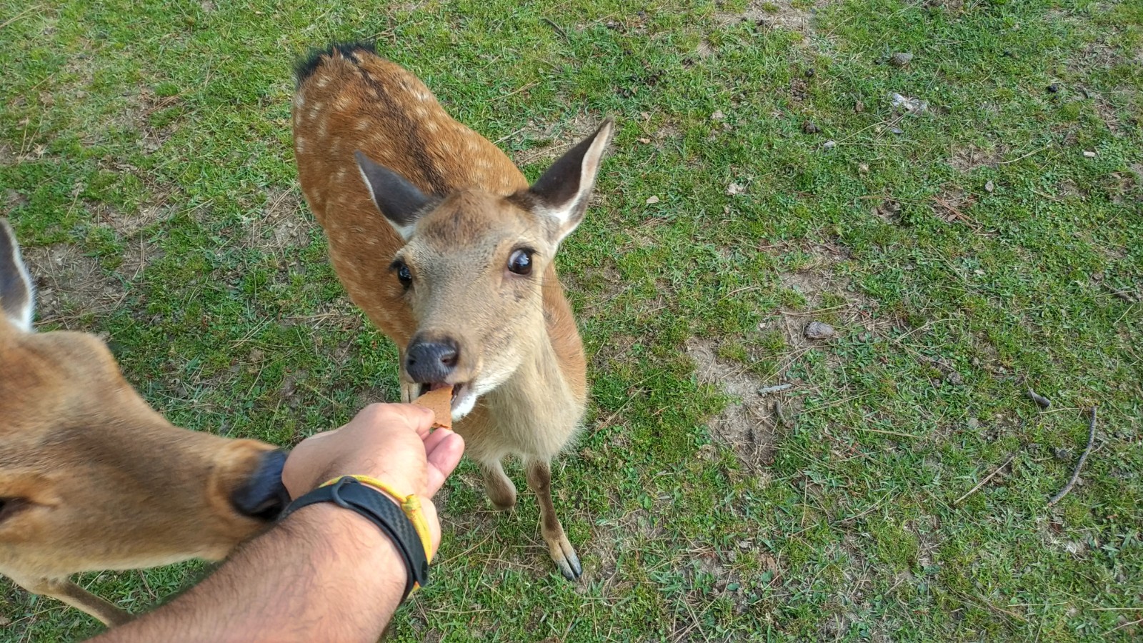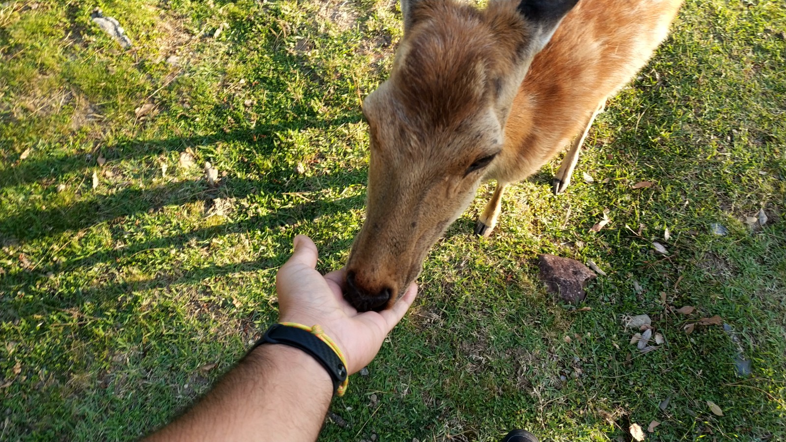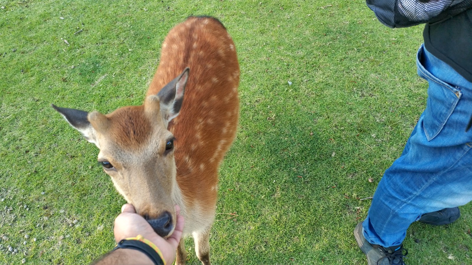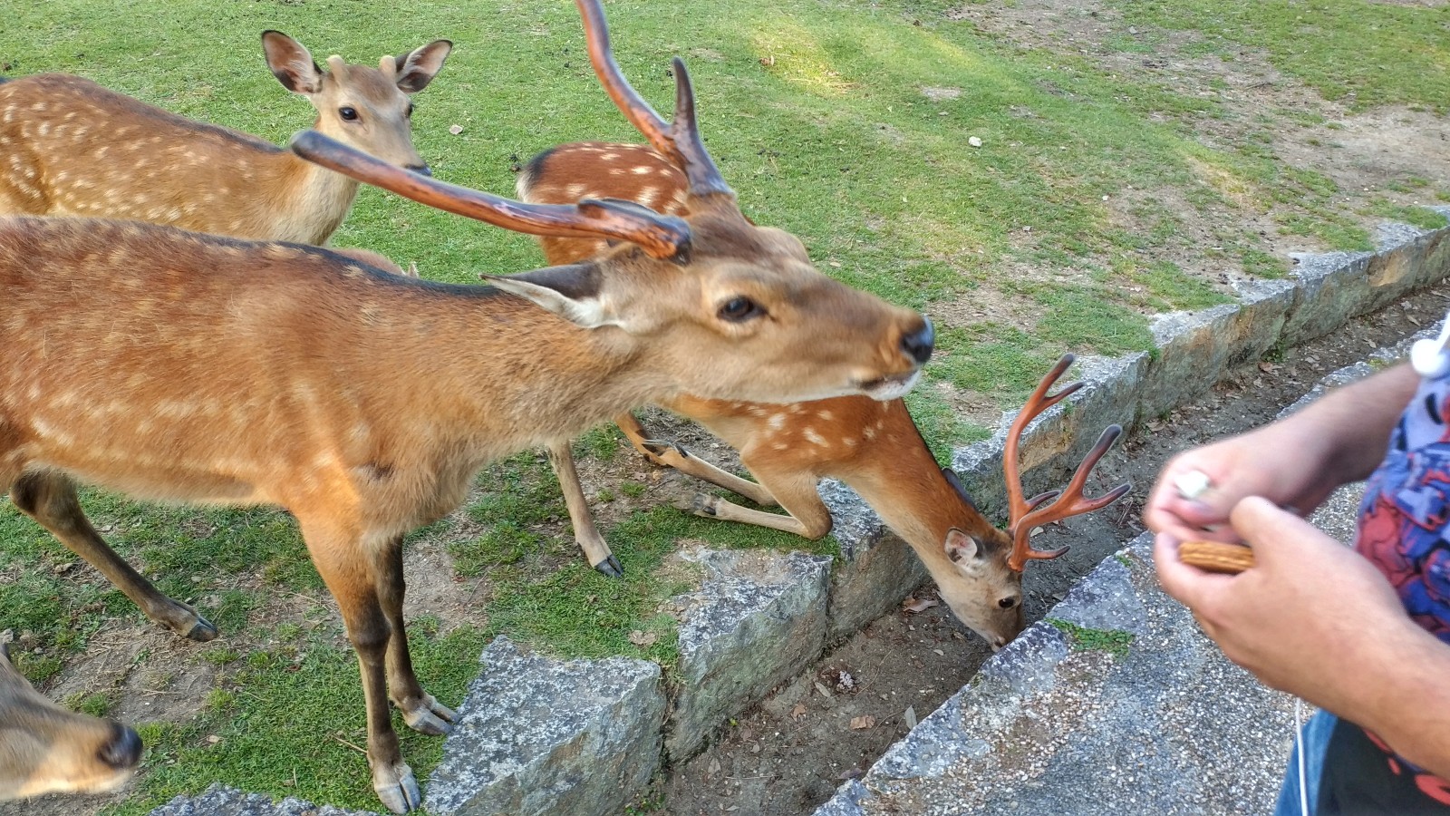 Compramos unas galletas para ciervos que vendían ahí por 150 Yen (1,15€) y estuvimos un par de horas dando vueltas y acariciando ciervos, ciervos que en cuanto ven la galleta te persiguen en manada como zombis, bastante curioso, alguno incluso me mordía la camisa o me daba toquecitos con los cuernos para que les dieras más , había alguno listo que incluso hacía reverencias. Después de esto volvemos al hotel, una ducha y a descansar.