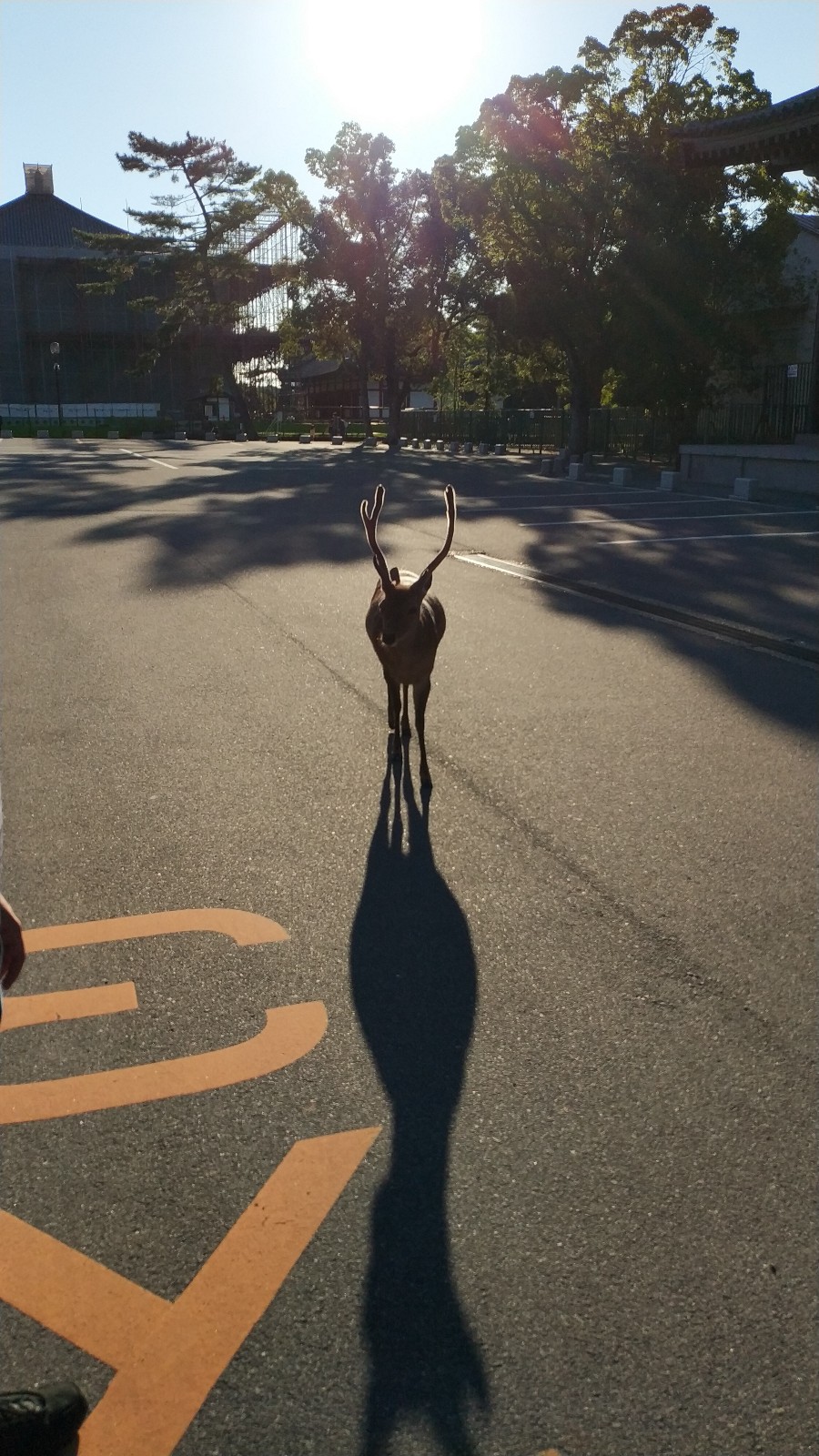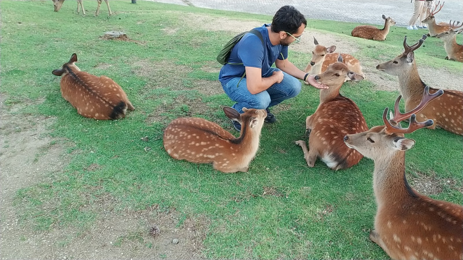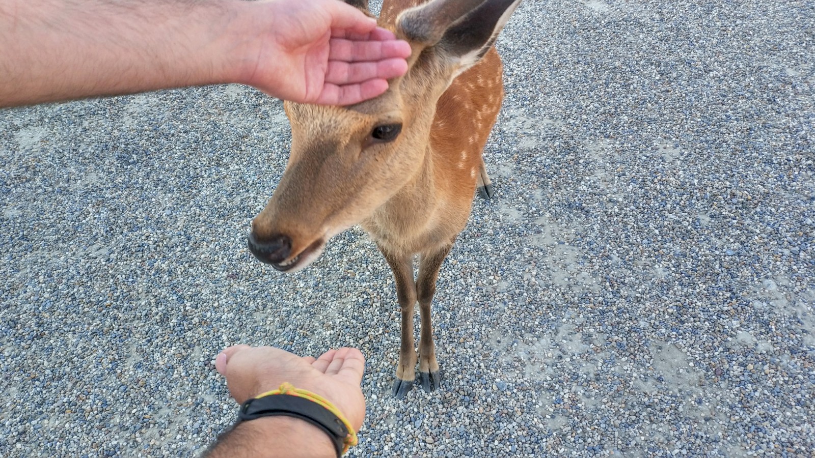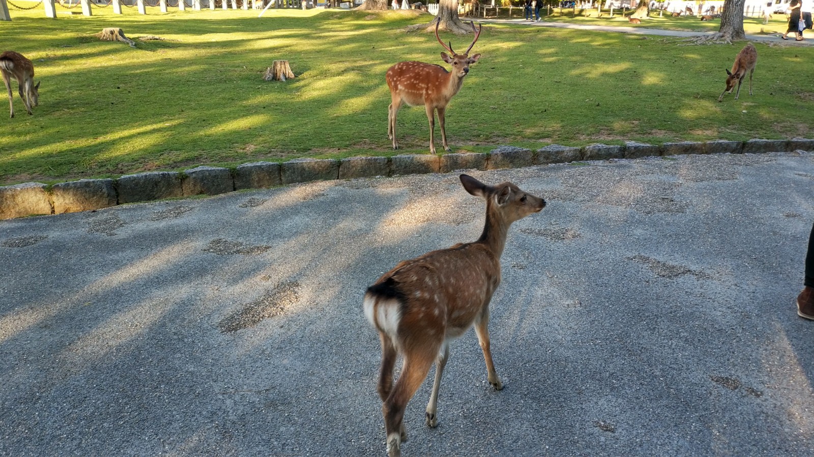 Compramos unas galletas para ciervos que vendían ahí por 150 Yen (1,15€) y estuvimos un par de horas dando vueltas y acariciando ciervos, ciervos que en cuanto ven la galleta te persiguen en manada como zombis, bastante curioso, alguno incluso me mordía la camisa o me daba toquecitos con los cuernos para que les dieras más , había alguno listo que incluso hacía reverencias. Después de esto volvemos al hotel, una ducha y a descansar.