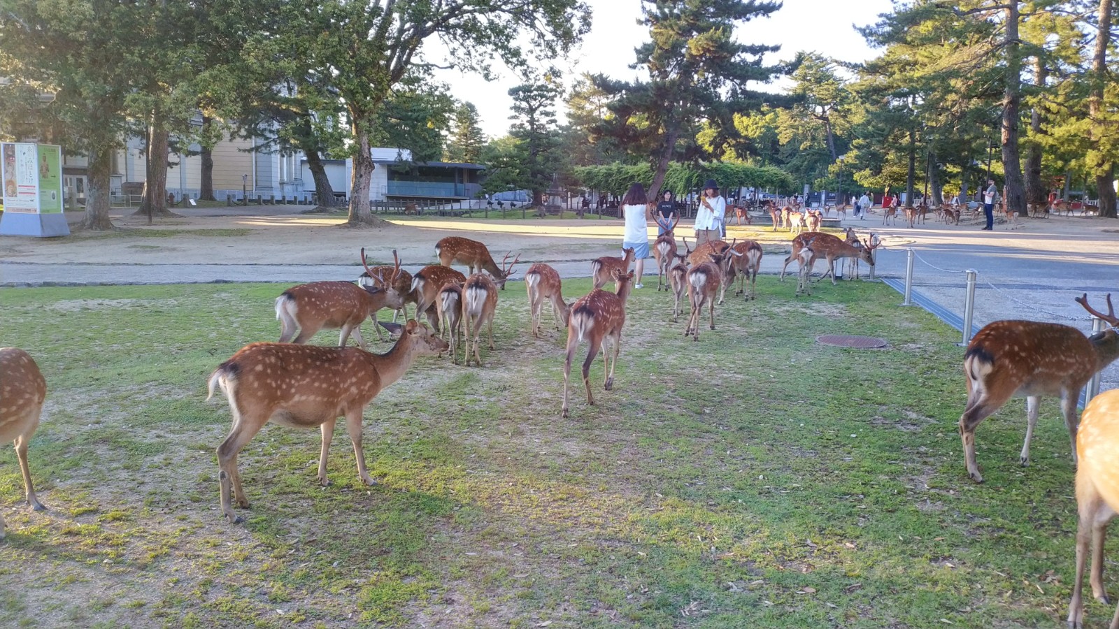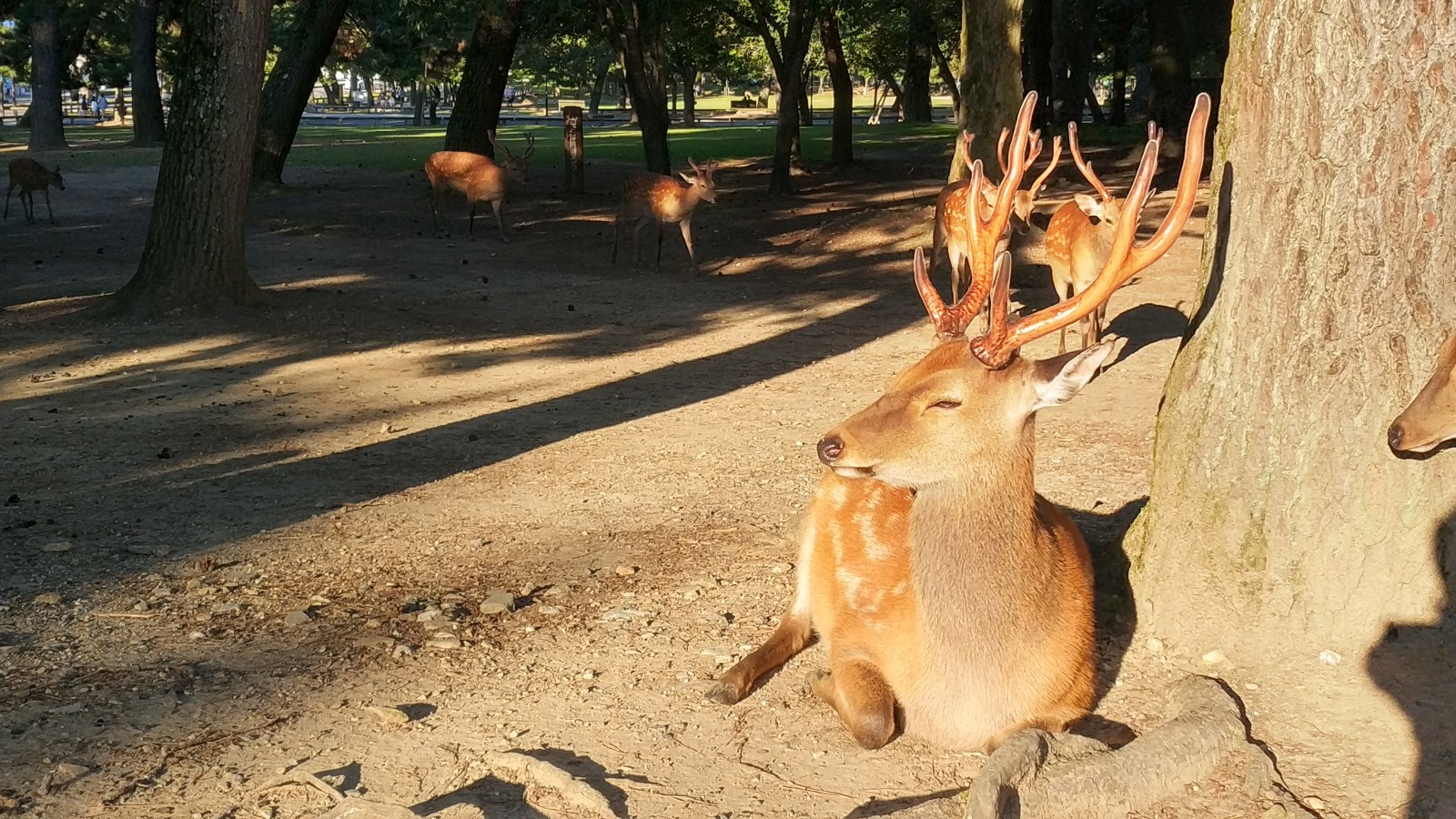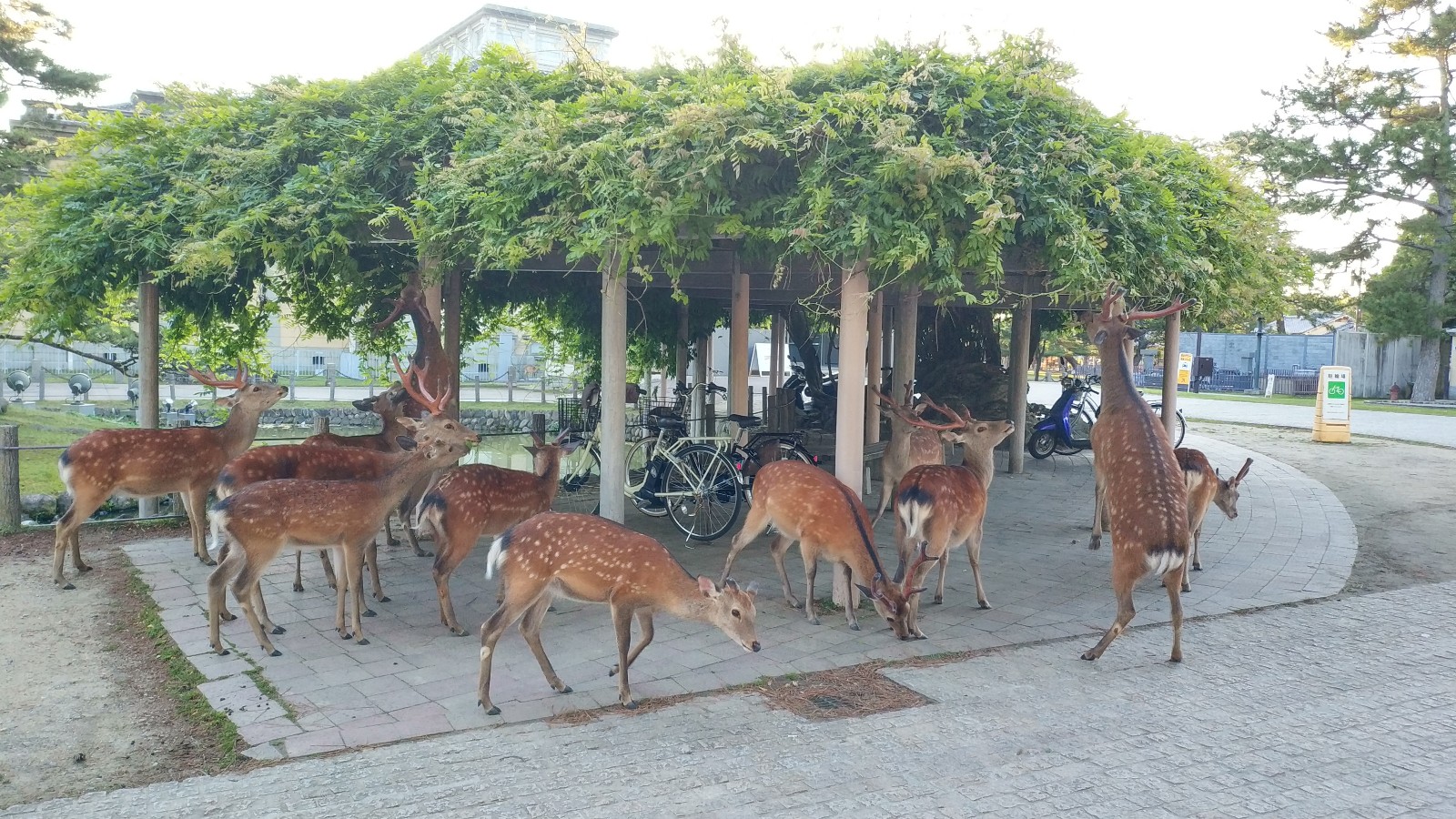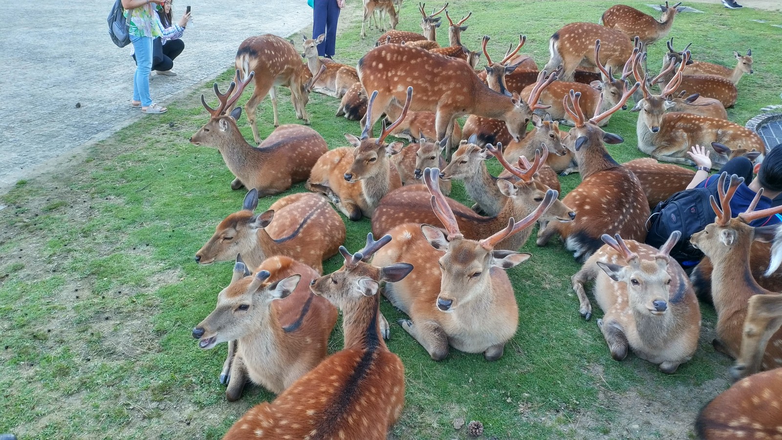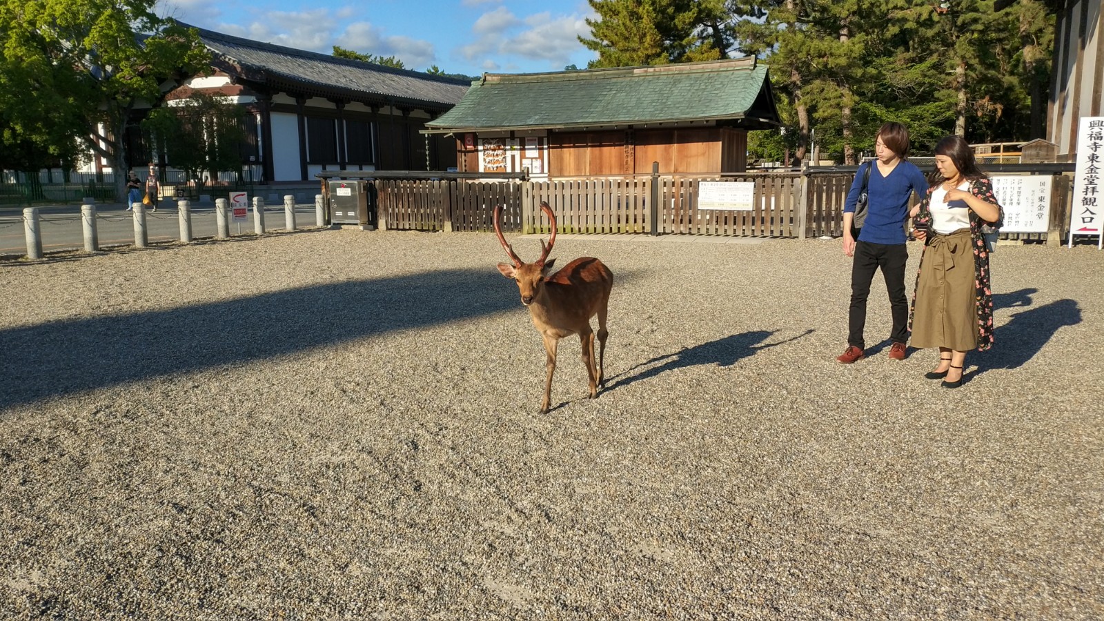 Compramos unas galletas para ciervos que vendían ahí por 150 Yen (1,15€) y estuvimos un par de horas dando vueltas y acariciando ciervos, ciervos que en cuanto ven la galleta te persiguen en manada como zombis, bastante curioso, alguno incluso me mordía la camisa o me daba toquecitos con los cuernos para que les dieras más , había alguno listo que incluso hacía reverencias. Después de esto volvemos al hotel, una ducha y a descansar.