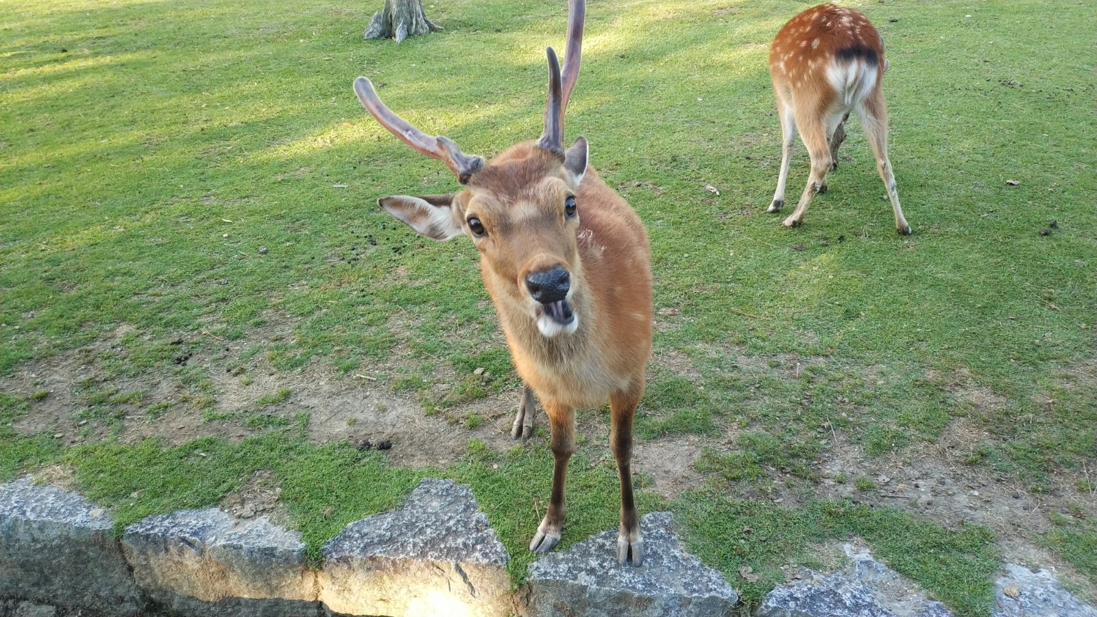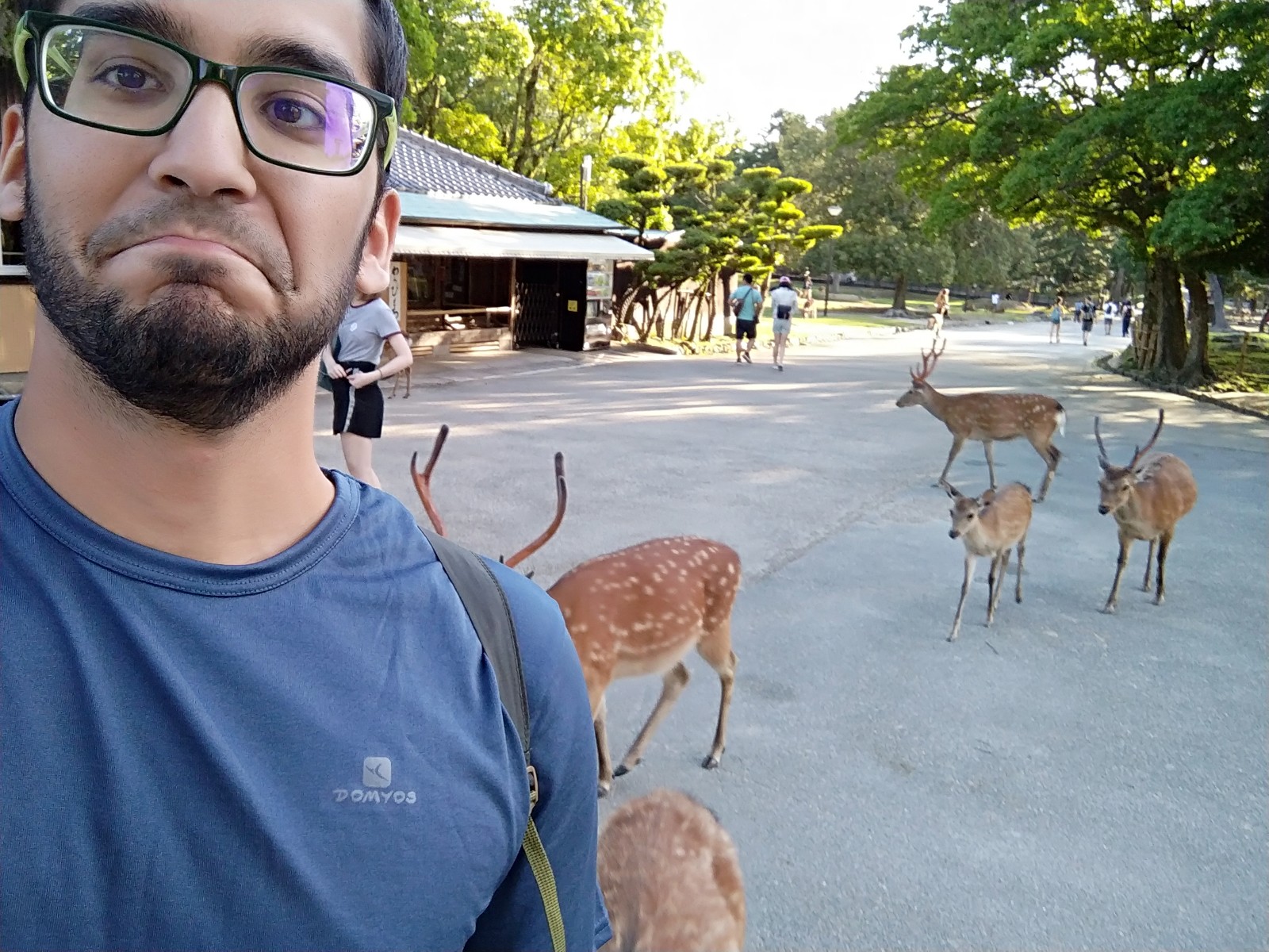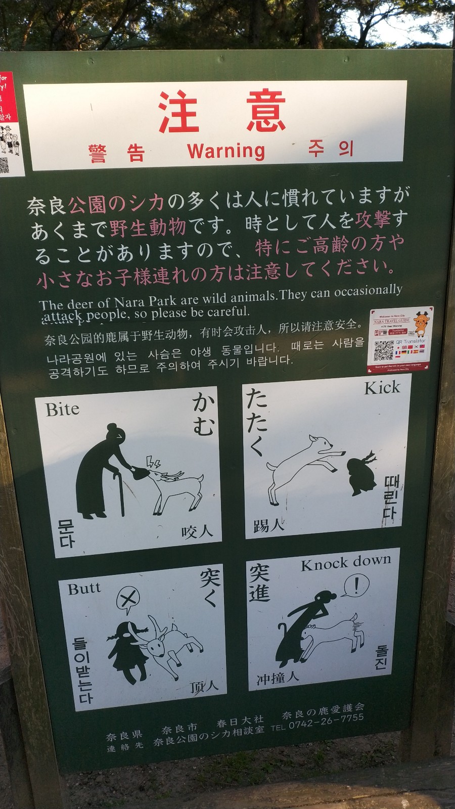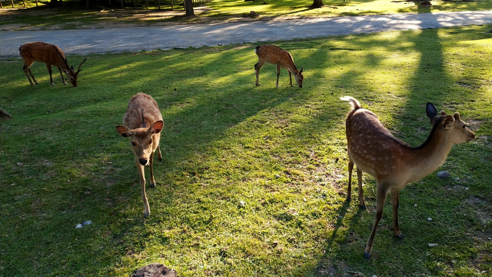 Compramos unas galletas para ciervos que vendían ahí por 150 Yen (1,15€) y estuvimos un par de horas dando vueltas y acariciando ciervos, ciervos que en cuanto ven la galleta te persiguen en manada como zombis, bastante curioso, alguno incluso me mordía la camisa o me daba toquecitos con los cuernos para que les dieras más , había alguno listo que incluso hacía reverencias. Después de esto volvemos al hotel, una ducha y a descansar.