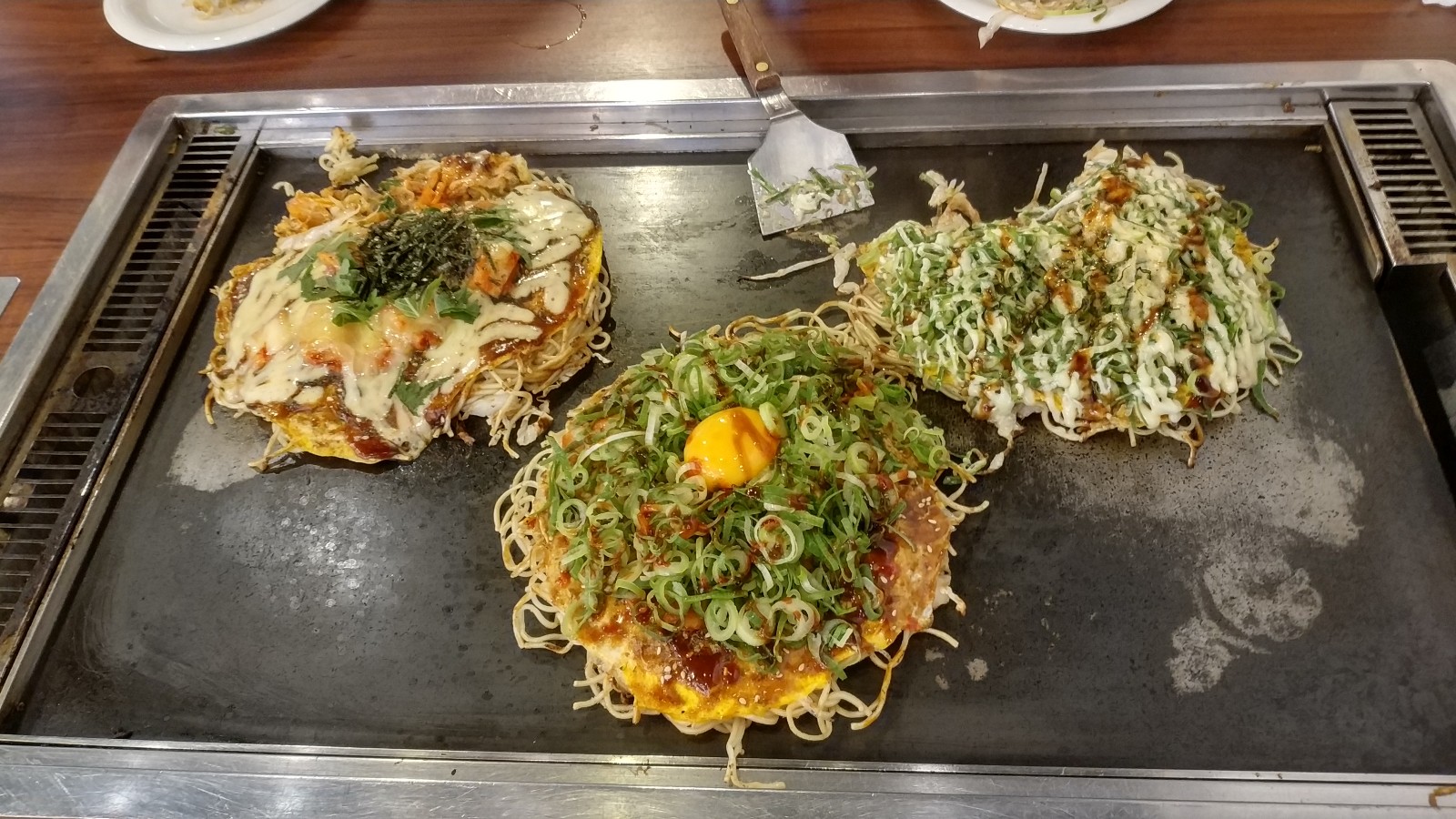 Okonomiyaki, el mío era picante con huevo y la cosa verde esa, otro de queso y otro de algo ?