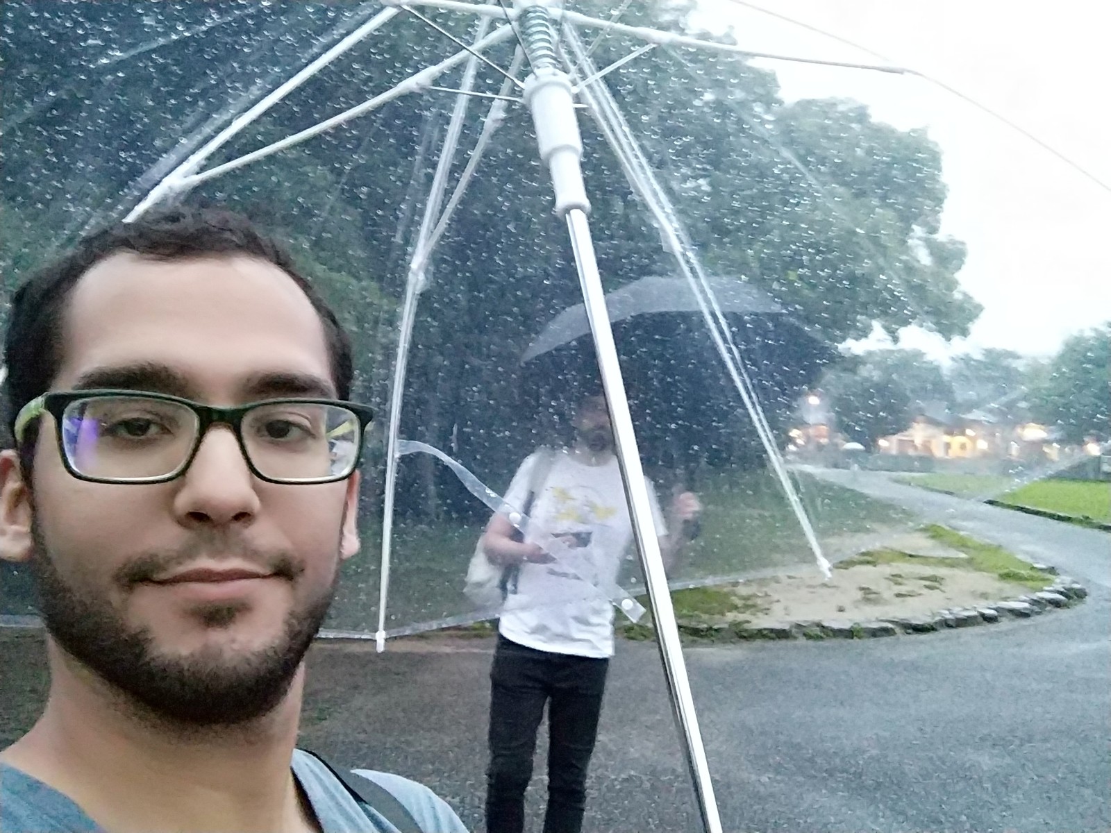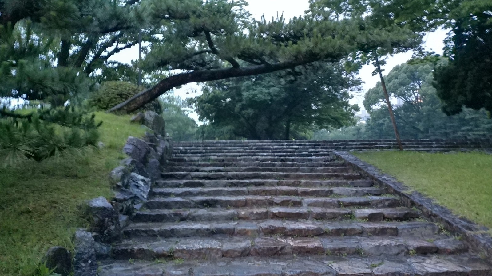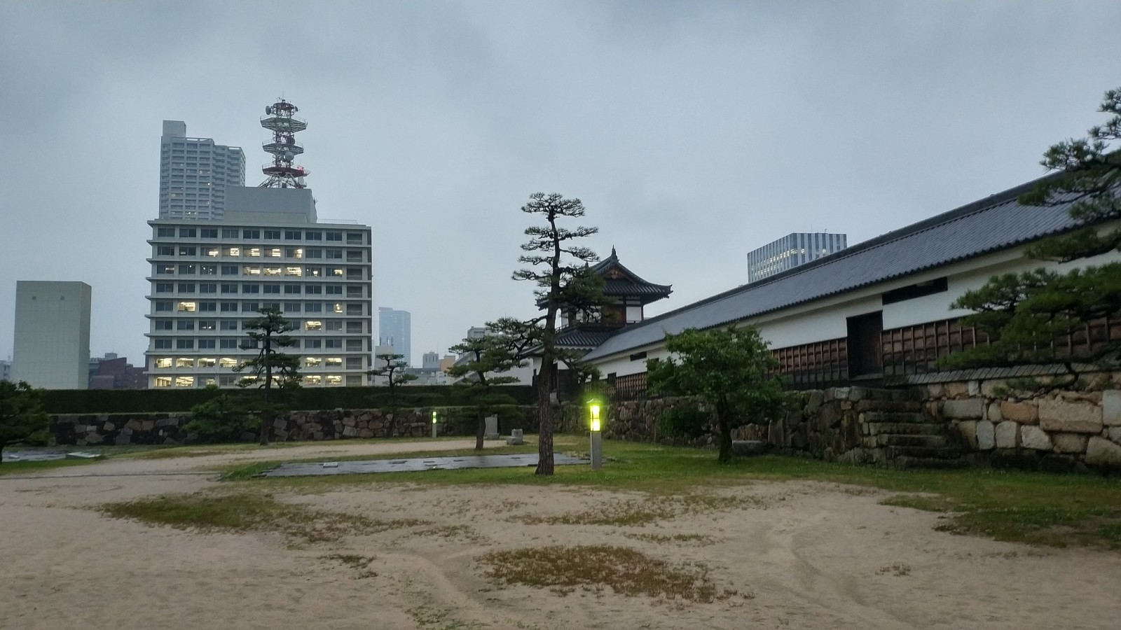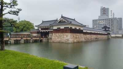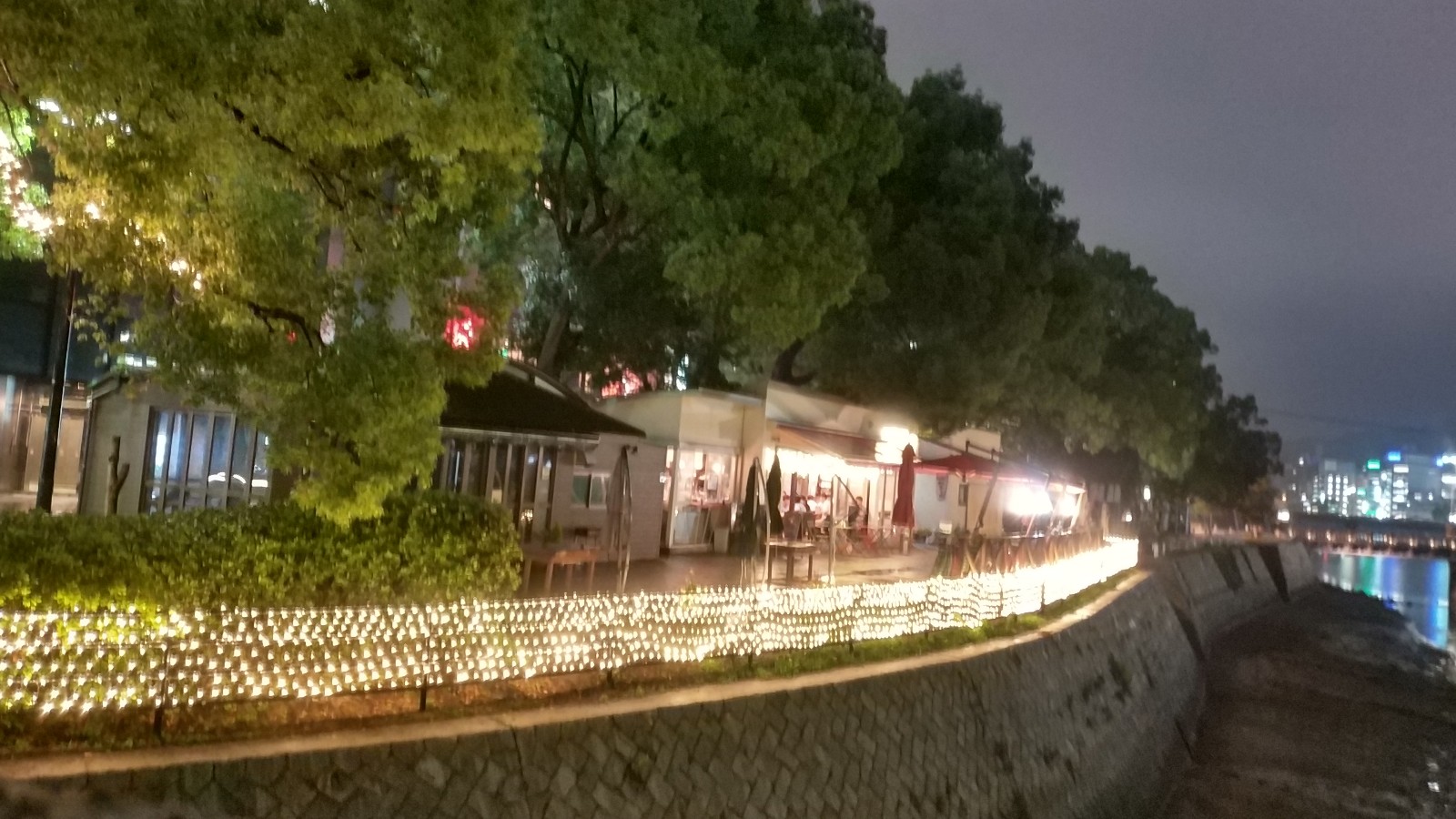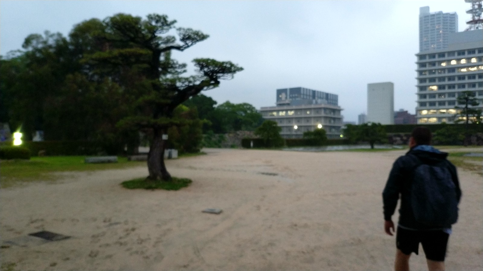 También pasamos por el castillo de Hiroshima y vemos los jardines de noche bajo la lluvia.