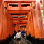 Una vez terminamos aquí decidimos ir a ver los Torii del Fushimi-inara Taisha, un santuario dedicado a Inari, el dios del arroz y por consiguiente el patrón de los comerciantes, un lugar donde te puedes pasar horas caminando entre estas puertas rojas que se extienden durante 4Km por la montaña. Para llegar intentamos usar un tren que nos acerca, nos cuesta el ticket 210 Yen (1,60) a cada uno pero nos equivocamos de tren y cogimos uno rápido que se saltaba nuestra parada (y parecía de lujo) así que nos bajamos y vamos al otro andén para coger el tren hacia el otro lado, al final conseguimos llegar.