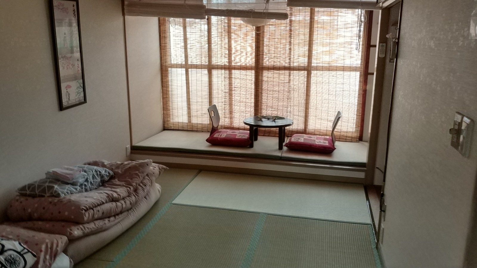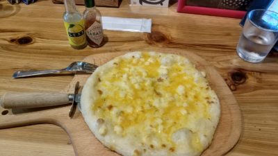 A las diez y media ya estamos dejando las cosas en el nuevo alojamiento y nos vamos a dar un paseo, desayunamos en un bar tranquilo bastante agradable que lo llevan dos señoras muy majas, pizza de 3 quesos y limonada 900 Yen (7€), comemos y seguimos nuestro camino.