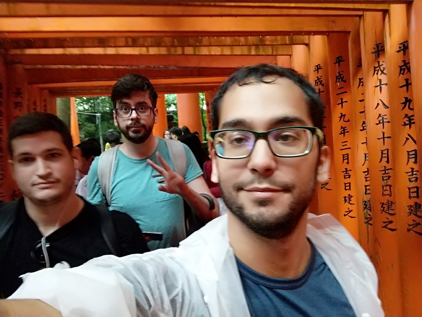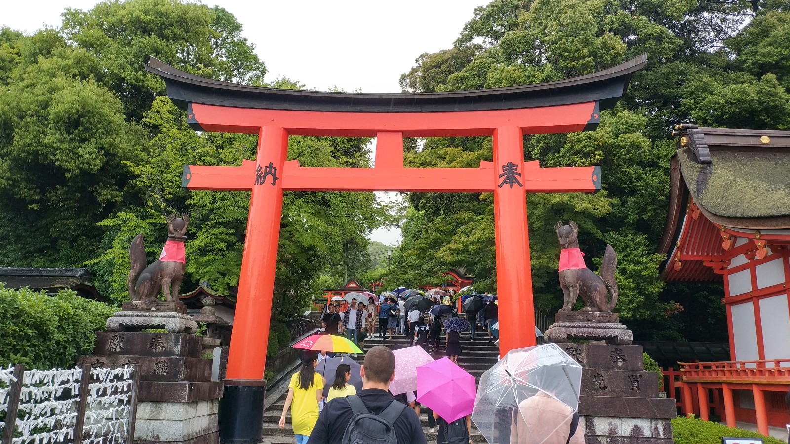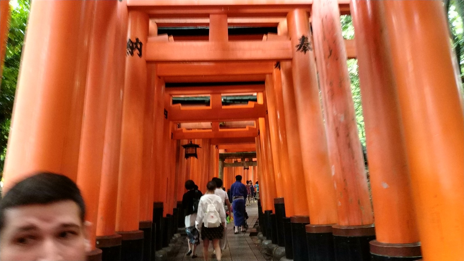 Una vez terminamos aquí decidimos ir a ver los Torii del Fushimi-inara Taisha, un santuario dedicado a Inari, el dios del arroz y por consiguiente el patrón de los comerciantes, un lugar donde te puedes pasar horas caminando entre estas puertas rojas que se extienden durante 4Km por la montaña. Para llegar intentamos usar un tren que nos acerca, nos cuesta el ticket 210 Yen (1,60) a cada uno pero nos equivocamos de tren y cogimos uno rápido que se saltaba nuestra parada (y parecía de lujo) así que nos bajamos y vamos al otro andén para coger el tren hacia el otro lado, al final conseguimos llegar.